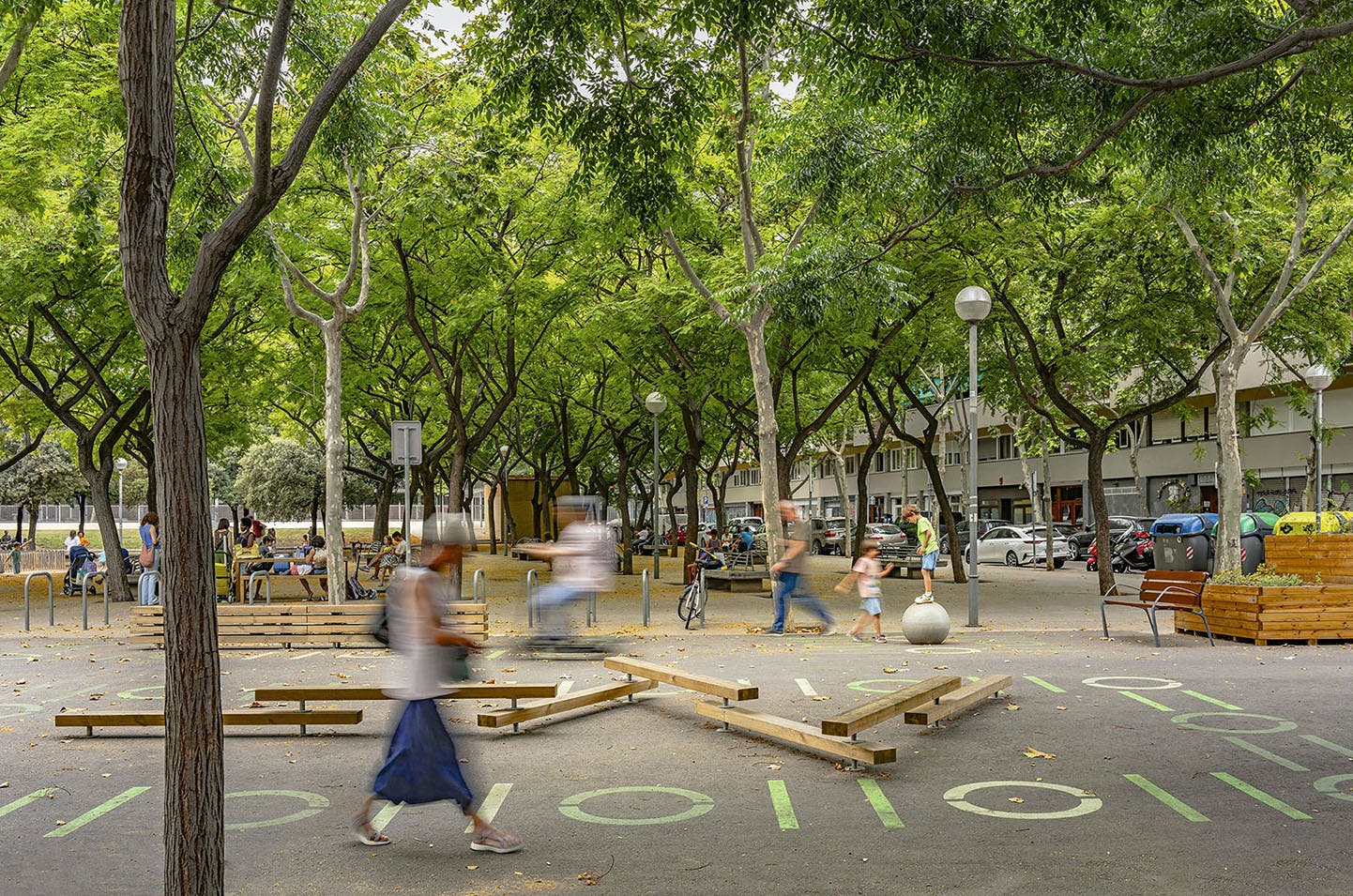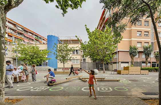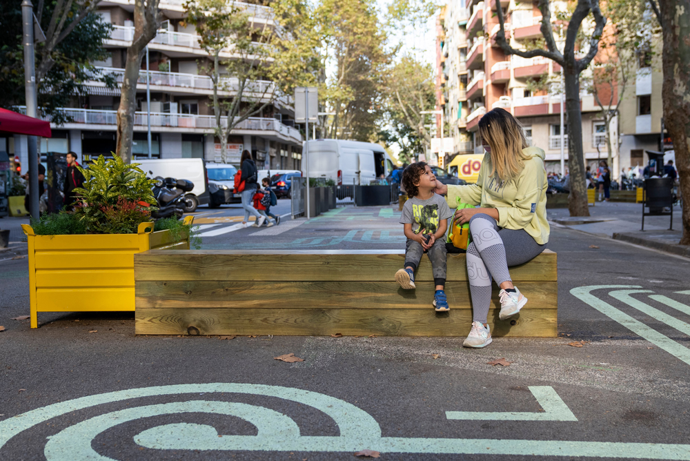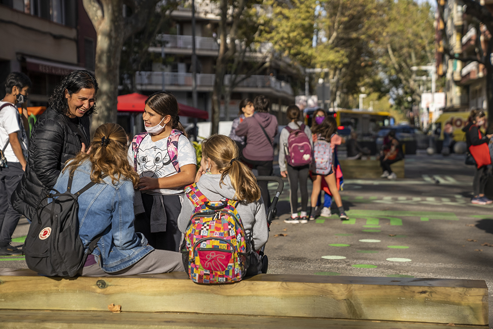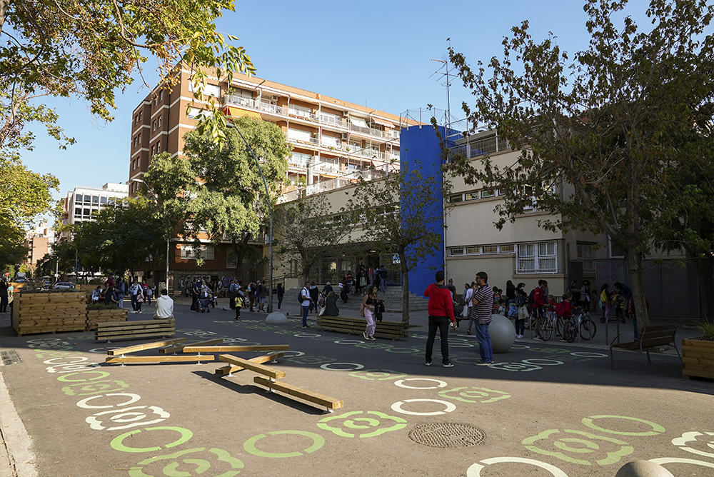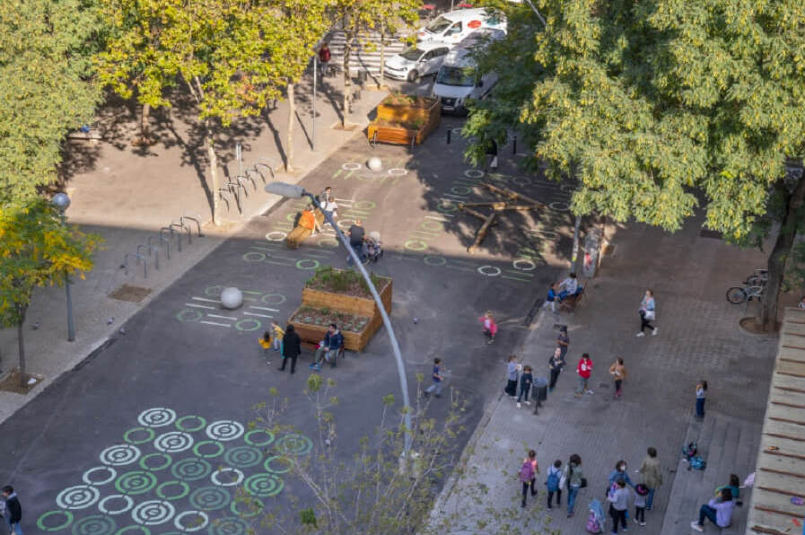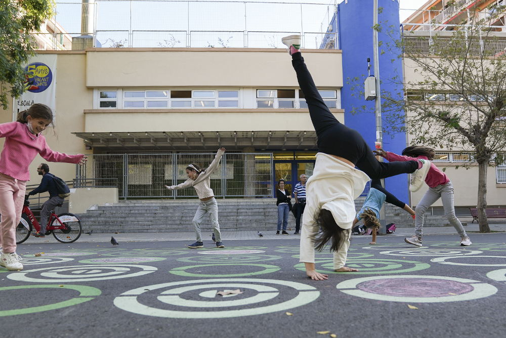 A child-centred and participatory approach guided the project: students, parents, residents, and local stakeholders contributed to decisions about circulation, play features, and spatial organisation. The intervention also connects the school with the adjacent Plaça del Sòl de Baix, effectively extending the school-yard into a park-like public space, promoting independent mobility, play, and engagement with the broader urban environment. This transformation converted a former traffic-dominated street into a vibrant, inclusive, and multifunctional school-street, demonstrating how street redesign can enhance child safety, mobility, play opportunities, and community interaction.