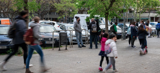 The Carrer de Fígols intervention, as part of Barcelona’s Protegim les Escoles programme, is a clear example of a school-street transformation, where the street has been repurposed primarily for children and community use. Prior to the intervention, Carrer de Fígols featured two very different pavements: the left-hand pavement served as a circulation space for families entering the school, while the right-hand pavement, bordering Plaça del Sòl de Baix, was wider, shaded by trees, and used by pedestrians, cyclists, and children on scooters or bicycles. The carriageway allowed vehicle traffic, including double parking during school drop-off times, while pedestrian crossings were only at the street’s ends, extending routes between the school and the park.