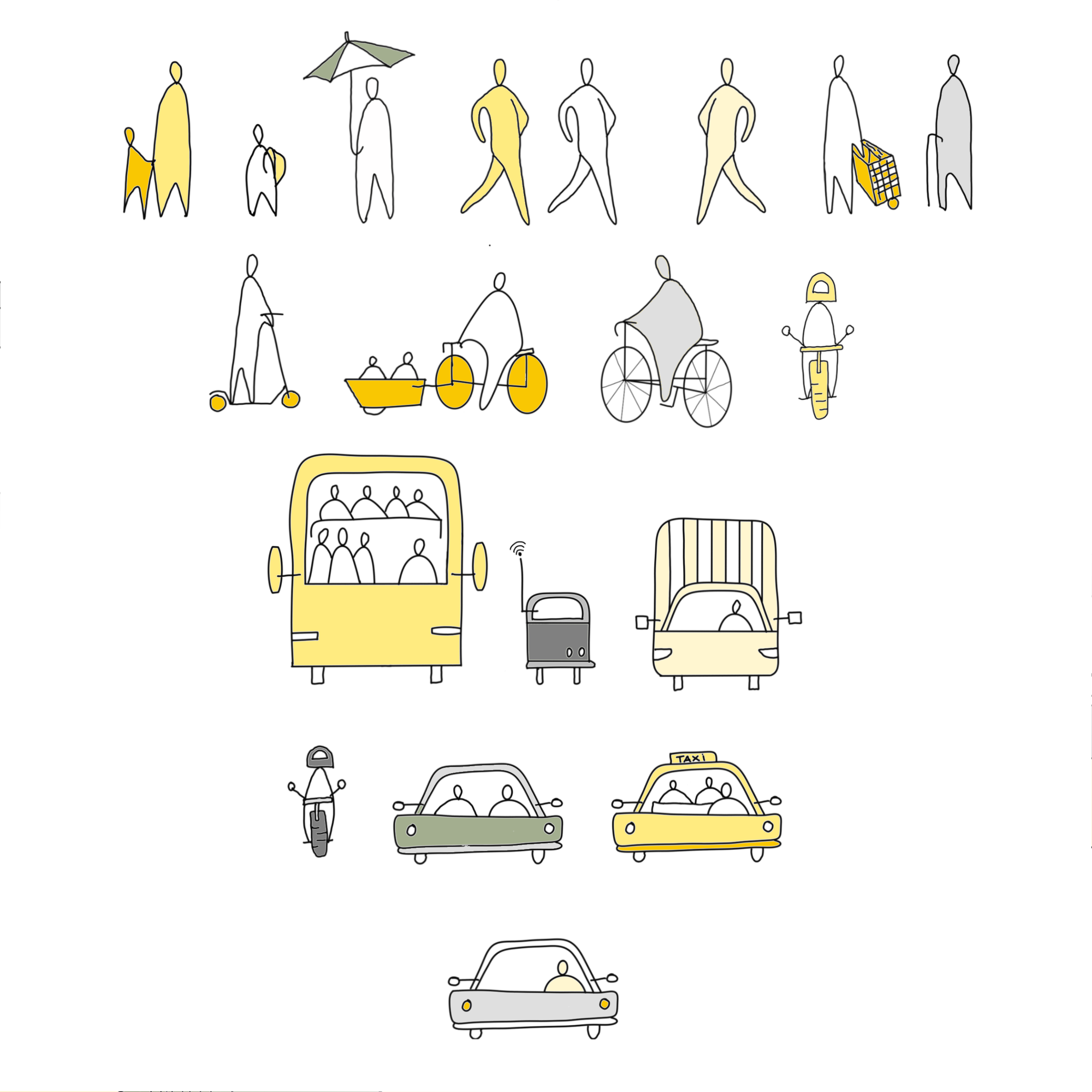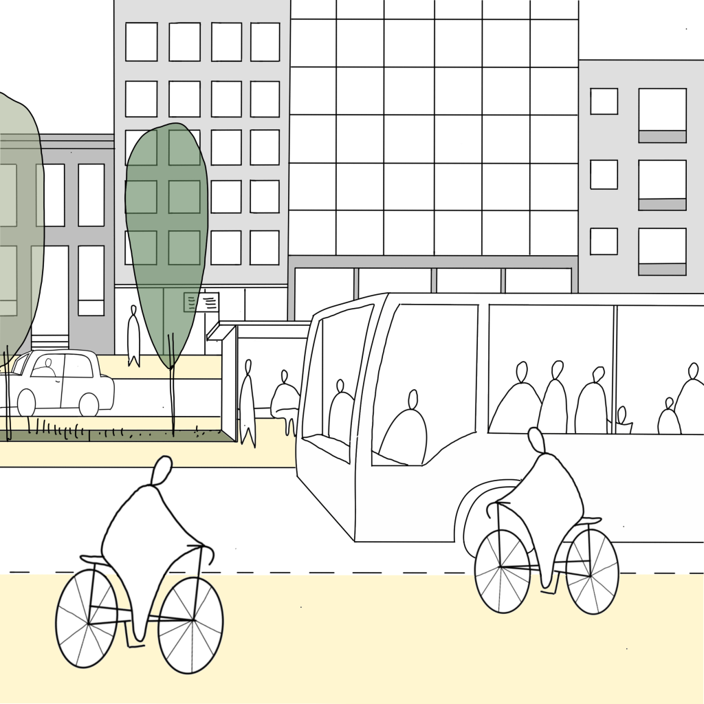 There are many forms of public transport. It is important to implement and integrate these systems into the street space as part of the public space. Adaptation for dedicated lanes or of frequency and speed, comfortable and safe waiting places, reliability, and punctuality are important factors for good public transport. New technology can also facilitate public transport/shared mobility modes.