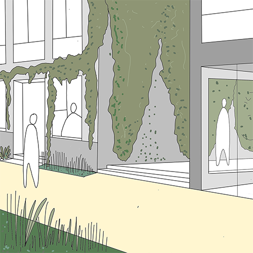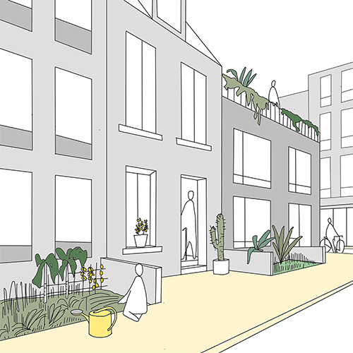 Vertical facades, plants / pocket gardens contribute to a greener character of streets. In smaller streets it can be a way to introduce gardening into these spaces. They enhance maintenance processes and are a positive response to the need for shading, temperature, humidity, and noise control.