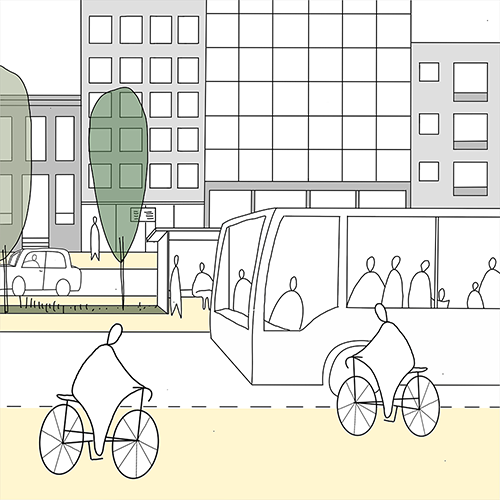 There are many forms of public transport. It is important to implement and integrate these systems into the street space as part of the public space. Adaptation for dedicated lanes or of frequency and speed, comfortable and safe waiting places, reliability, and punctuality are important factors for good public transport. New technology can also facilitate public transport/shared mobility modes.