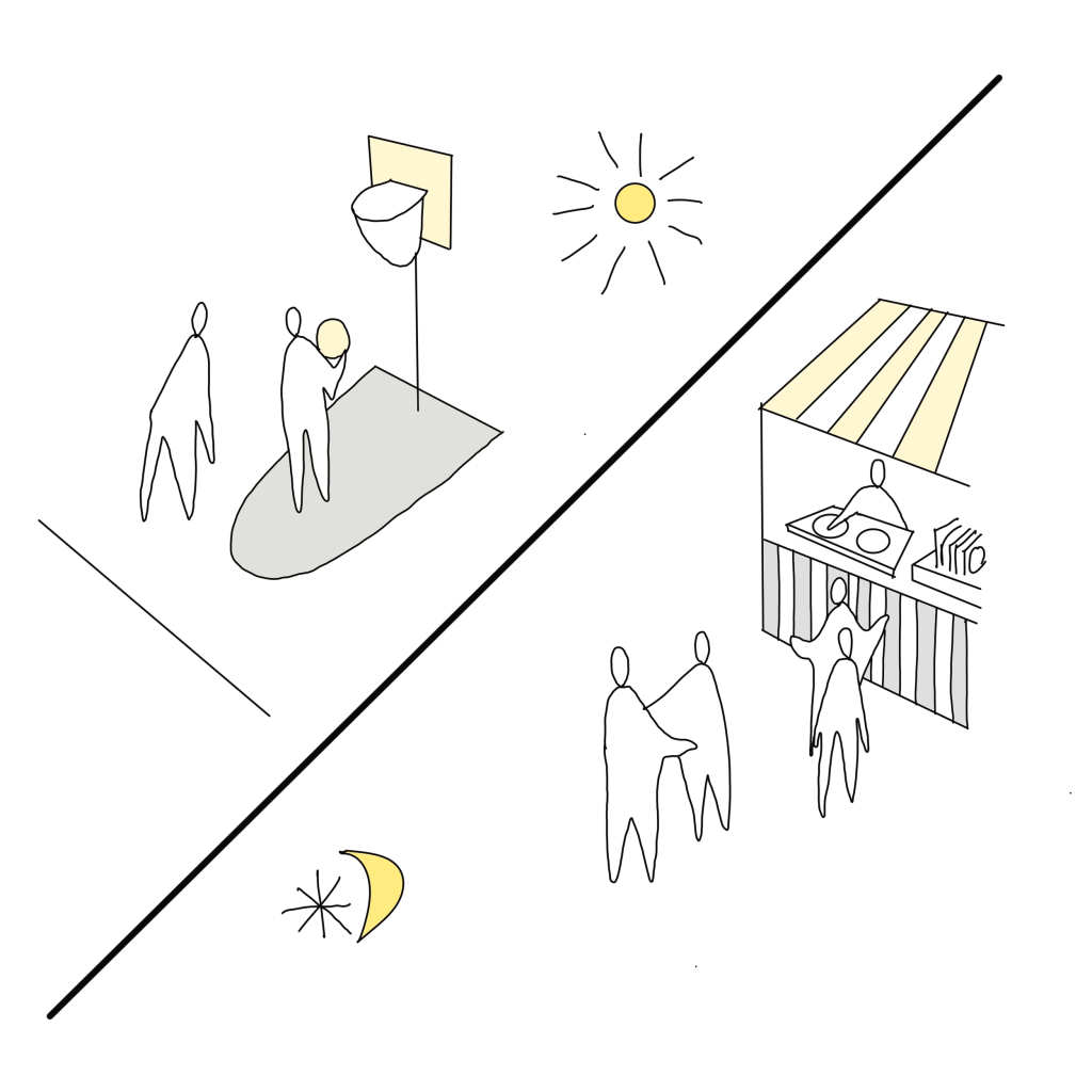Periodical events, from a play street to a music concert, need a certain basic infrastructure (electricity, traffic controlling objects, security service, etc.). This can be designed in an ambulant manner or can be part of the foundational design of streets.