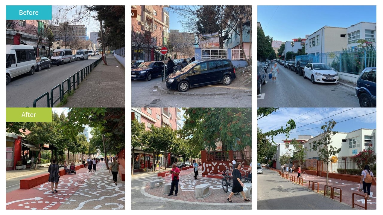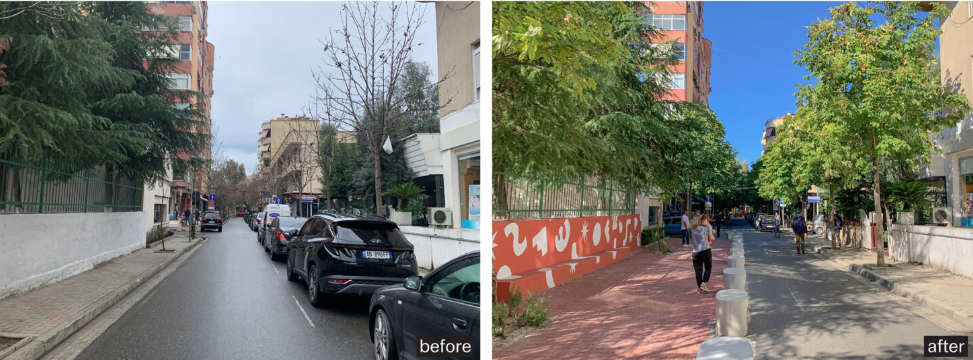 The results have been substantial. Traffic volumes decreased by 59% during school hours, and vehicle speeds dropped considerably. The street has become a place where children play and gather after school and on weekends, reinforcing its role as a community space. Moreover, the intervention reflects the goals of Tirana’s Walking Policy (2022), which prioritises walking as a key mode of transport—especially important in a city where many women do not own cars and rely on walking as their main form of mobility. Studies show that 66% of women in Tirana walk more than half of all their trips, making safe, well-designed pedestrian spaces crucial for daily life.