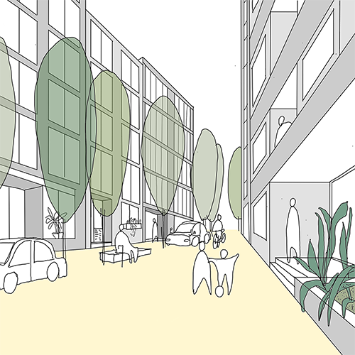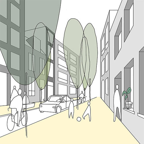 Local streets can be redesigned as green spaces that provide room for all kinds of social activities, in which proximity to flora and fauna is established. This is also a street for leisure and recreation, for pedestrians and cyclists.