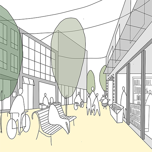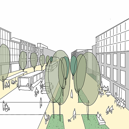 Many regular streets combine different types of flows – separated for pedestrians, cyclists, drivers – and places to stay (pedestrian areas). Street parking is standard in these streets. The regular street is based on a conventional system of spatial organisation and functional specialisation. Pedestrian area, cycling lanes, car park area, tree planting, service zone and driving lanes for (fast) motorised vehicles.