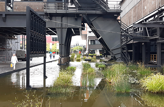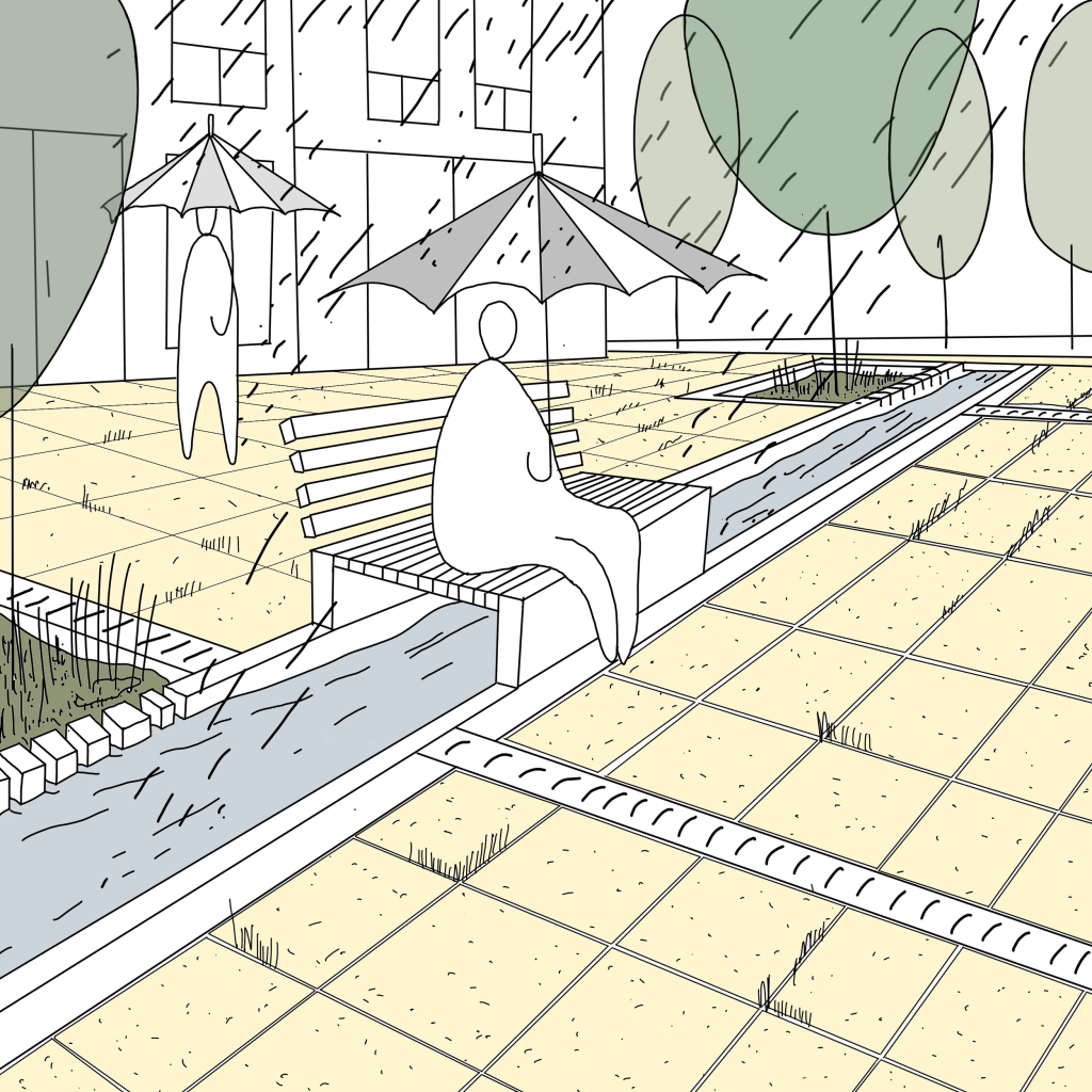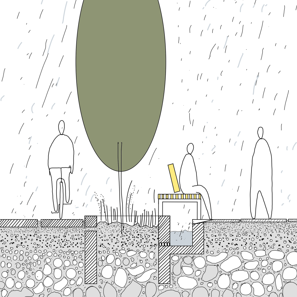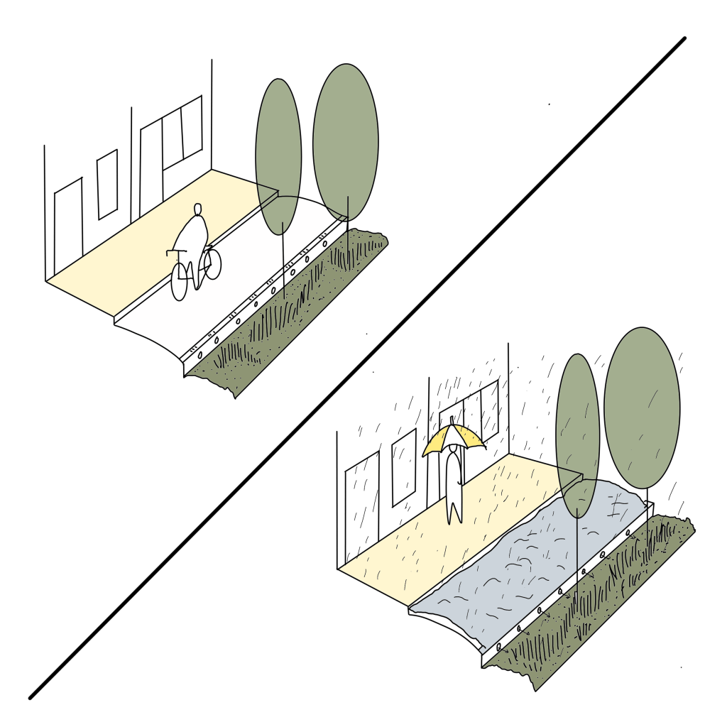 In order to manage peak load precipitation, water systems – of rainwater infiltration – should be flexible. Like combining a bike lane with a storm water system.